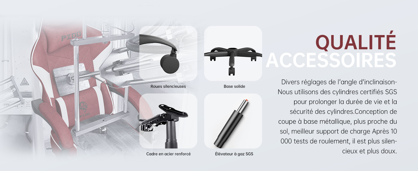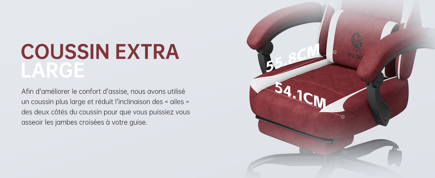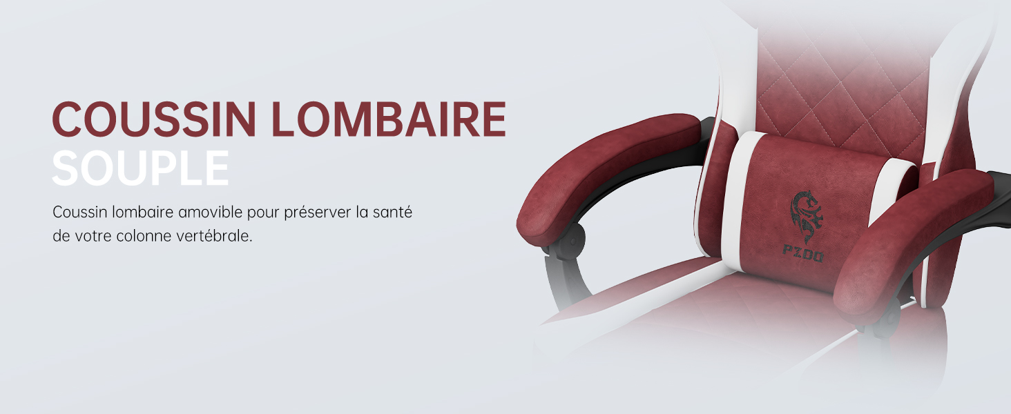 Le dossier de la chaise est conçu pour imiter les courbes naturelles de la colonne vertébrale, avec un coussin lombaire en velours de coton et un oreiller élastique ajustable. Ce design ergonomique permet de s'adapter à une large gamme de hauteurs, assurant un soutien maximal à la taille et au cou. L'arc incurvé du dossier et les appuys de cuisse renforcent le confort tout en maintenant une bonne posture lors de longues sessions d'utilisation.