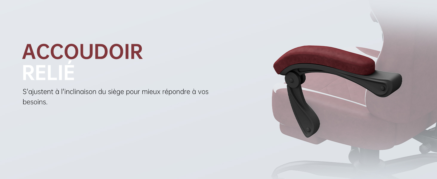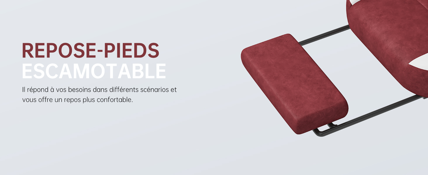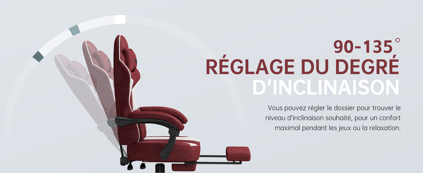 Le dossier s'incline jusqu'à 145°, offrant une position semi-allongée idéale pour le travail, le jeu ou la détente. Les accoudoirs réglables s'ajustent en hauteur et en angle, permettant d'adopter des postures variées. Le repose-pieds intégré et le coussin adapté à la taille réduisent la fatigue des jambes, alors que la structure robuste permet une utilisation prolongée sans perte de confort.